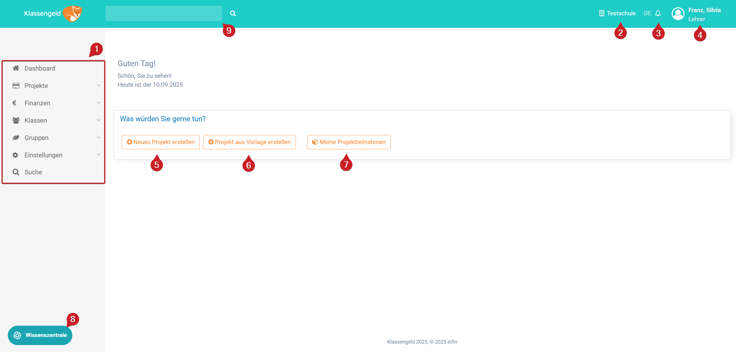 | 1. | Navigationsbar | Die NAV-Bar bietet Ihnen schnellen Zugriff auf die wichtigsten Bereiche in Klassengeld |