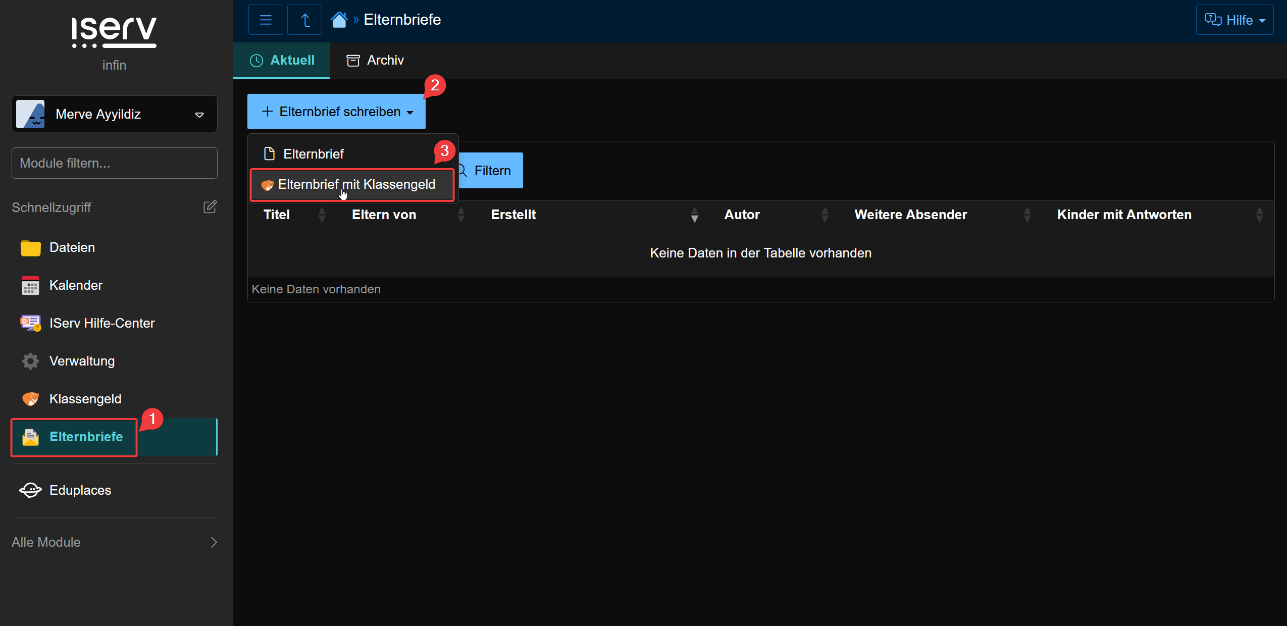 Nach der Anmeldung in IServ haben Sie beim Erstellen von Elternbriefen die Möglichkeit, ein Projekt aus Klassengeld auszuwählen. Dadurch werden die wichtigsten Informationen zum jeweiligen Projekt automatisch über IServ an die Erziehungsberechtigten übermittelt. Im Folgenden finden Sie eine Schritt-für-Schritt-Anleitung: