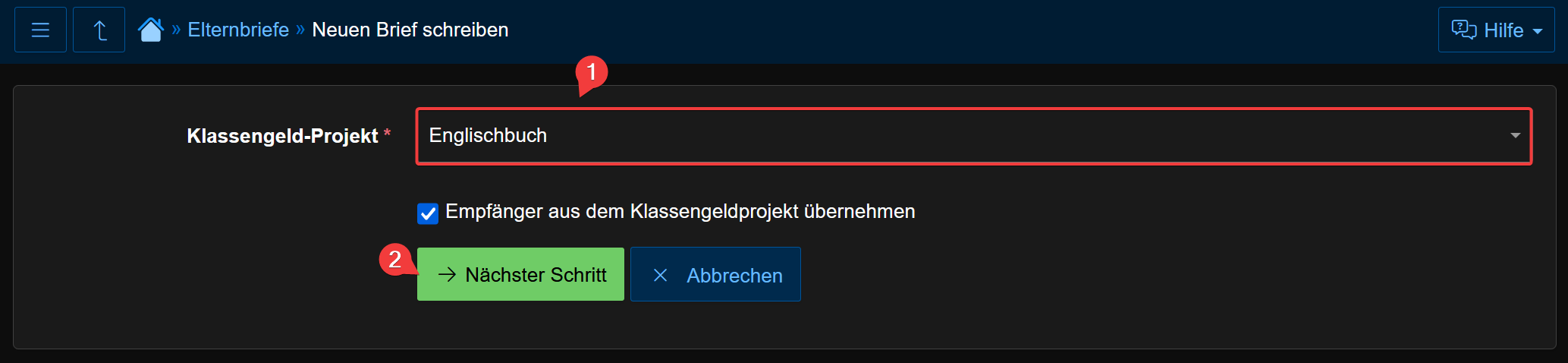 Wählen Sie sich nun das entsprechende Projekt in der Liste heraus und setzen Sie den Haken, wenn Sie die Empfänger aus dem Klassengeldprojekt übernehmen möchten.
