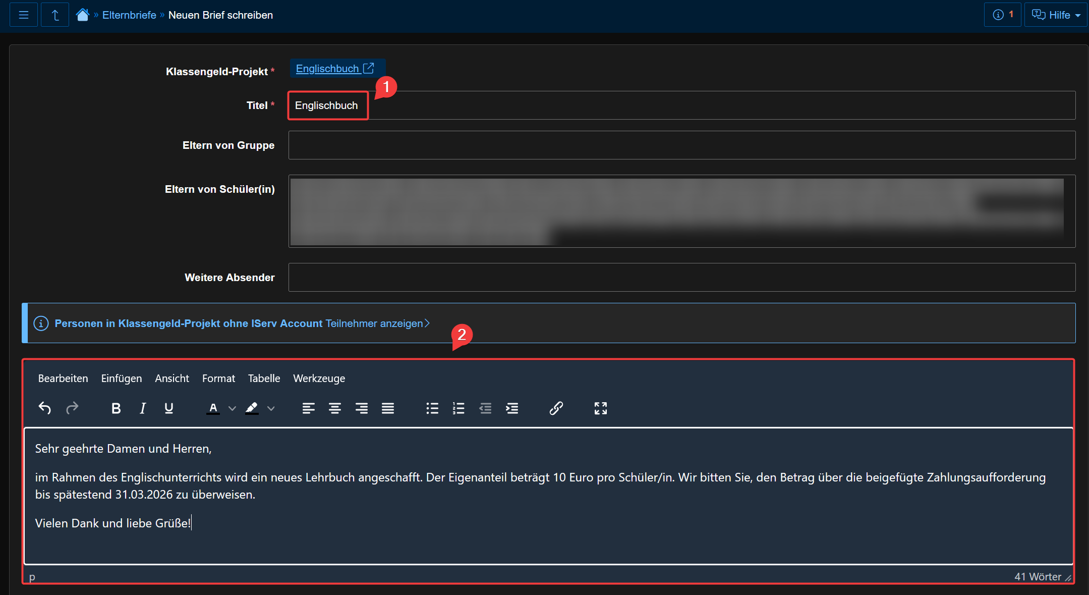 Klicken Sie auf "Senden", um den Elternbrief abzusenden.