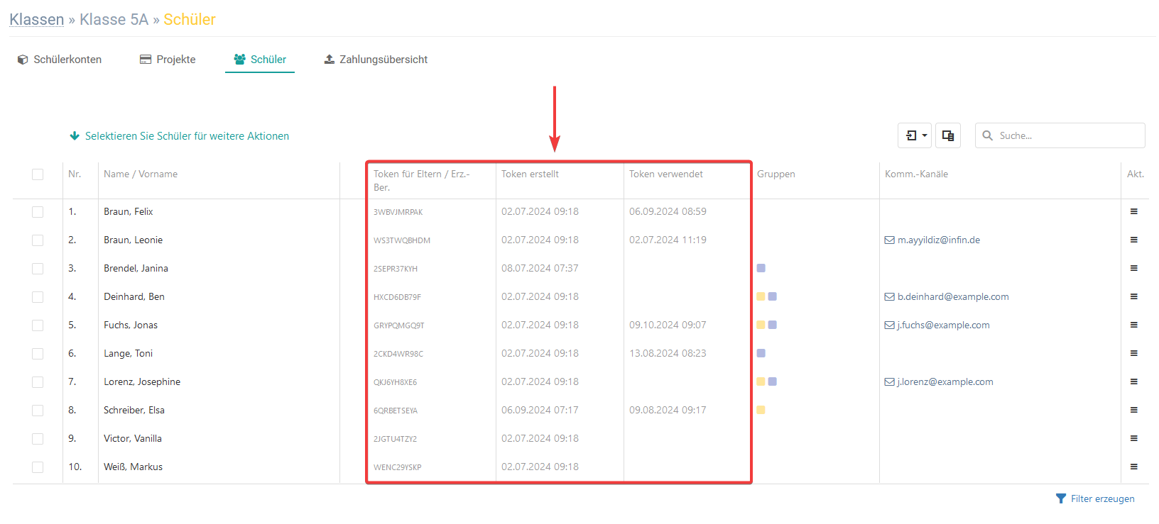 Unter dem Reiter Schüler, finden Sie den Token der Schüler, die sich in der ausgewählten Klasse befinden. Sie sehen ebenfalls zu welchem Zeitpunkt, das Token erstellt und ob bzw. wann es - seitens der Eltern - bei der Registrierung verwendet wurde.