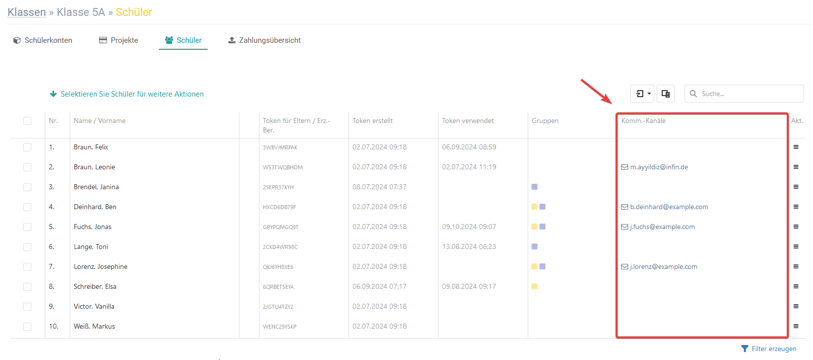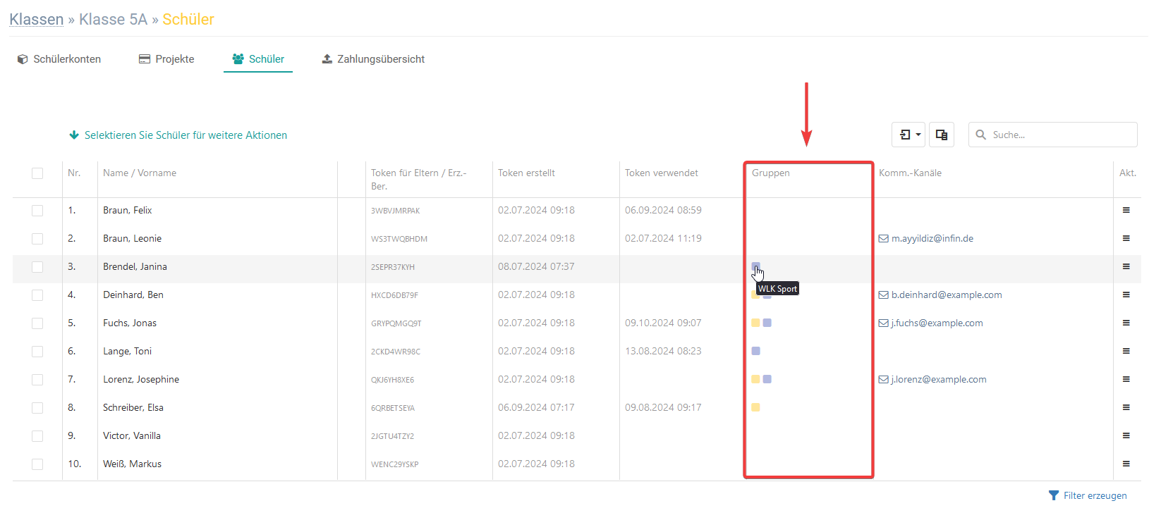 In dieser Spalte sehen Sie die E-Mail Adressen der Erziehungsberechtigten, die sie im Elternportal hinterlegt haben.