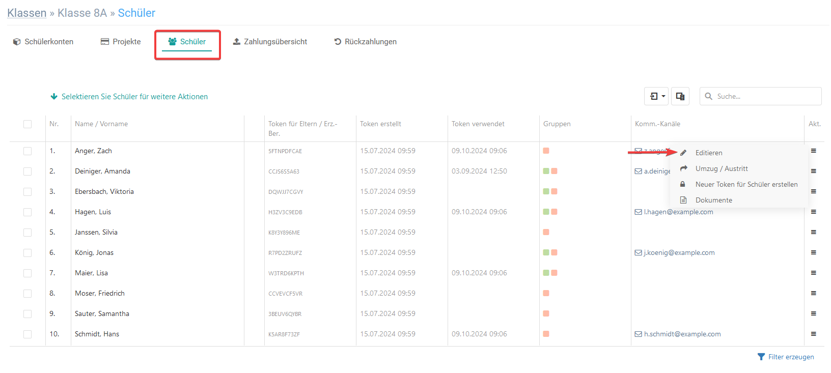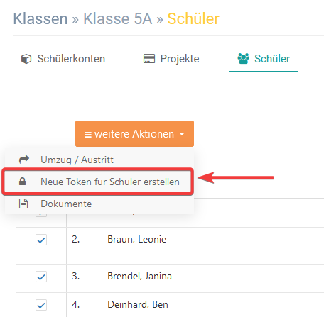 Wenn Sie einen neuen Token für einen oder mehrere Schüler erstellen möchten, setzten Sie zunächst alle entsprechenden Häkchen, gehen Sie auf weitere Aktionen und wählen Sie Neue Token für Schüler erstellen.