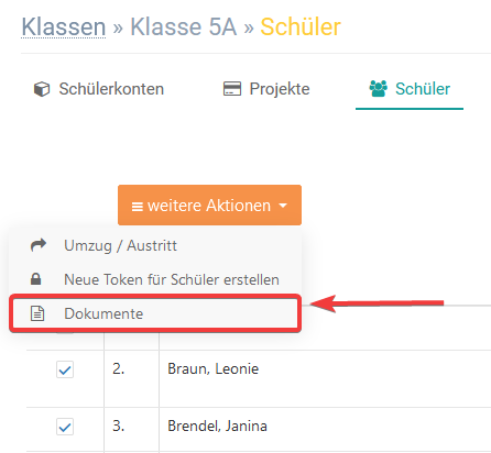 Um die Registrierungsinformation zu generieren, müssen Sie zunächst alle Schüler auswählen, die eine Registrierungsinfo erhalten sollten. Gehen Sie im nächsten Schritt auf den Button weitere Aktionen und klicken Sie auf Dokumente.