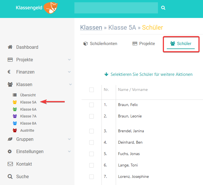 Gehen Sie in Ihrer Navigationsbar zu Klassen und wählen Sie die entsprechende Klasse aus der Liste aus. Klicken Sie anschließend auf die Registerkarte Schüler.