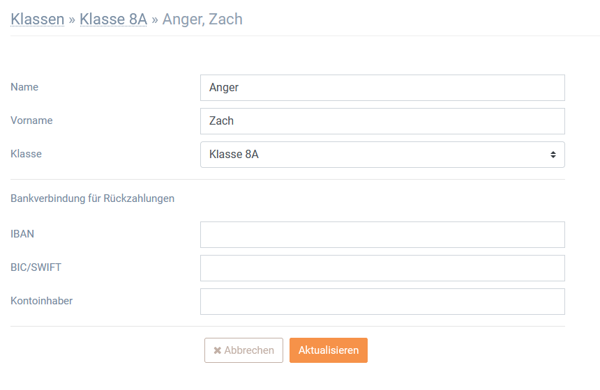 | Die Bankverbindung für die Rückzahlungen kommt von den Informationen, die die Eltern im Elternportal eingeben. Alle Änderungen hier werden auch m Elternportal übernommen. |
