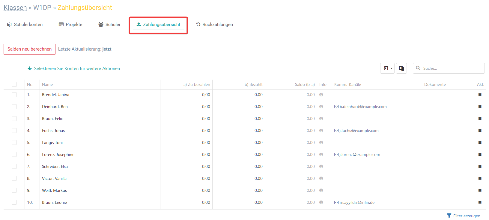 Sie erhalten eine detaillierte Darstellung, aller fälligen Zahlungen, sowie eine Auflistung der bereits - von den Erziehungsberechtigten - geleisteten Beträge.