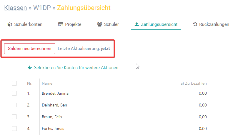 Gehen Sie in Ihrer Navigationsbar zu Klassen und wählen Sie die entsprechende Klasse aus der Liste aus. Klicken Sie anschließend auf die Registerkarte Zahlungsübersicht.