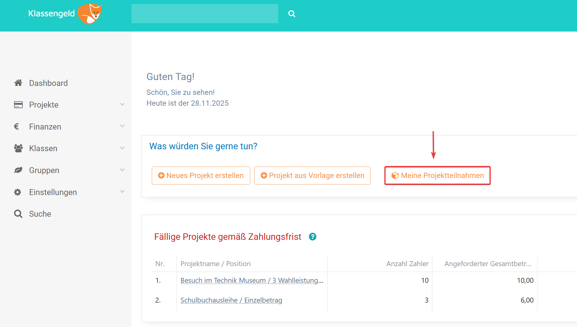 Der Schnellzugriff auf dem Dashboard (nur für Lehrkräfte) führt Sie direkt zu Ihrem Lehrerkonto. Dort finden Sie eine Übersicht aller Projekte, an denen Sie aktuell teilnehmen, sowie Ihren persönlicher Verwendungszweck, den Sie für das Aufladen Ihres Benutzerkontos nutzen können.